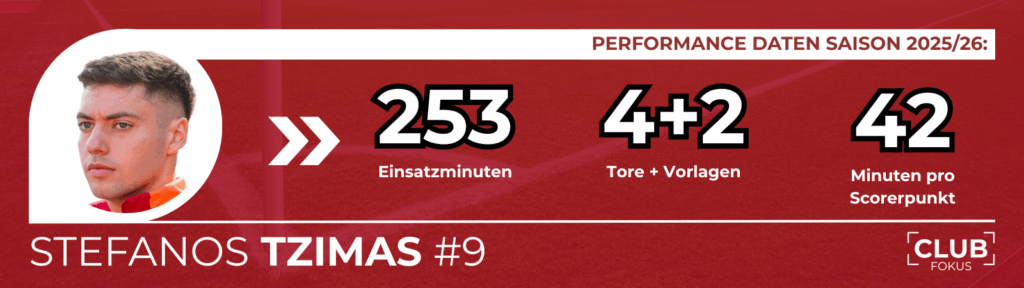 Mit diesen beiden Treffern in insgesamt nur 81 Einsatzminuten untermauerte Tzimas seine beeindruckende Torquote in dieser bislang noch jungen Saison. Obwohl er für Brighton erst 172 Pflichtspielminuten absolviert hat, kommt er dort bereits auf zwei Tore und zwei Vorlagen. Kumuliert mit seiner Nationalmannschaftsbilanz steht er bei sechs Scorerpunkten in nur 253 Minuten in dieser Saison – und ist damit alle 42 Minuten an einem Treffer direkt beteiligt. Zum Vergleich: Der derzeit überragende Harry Kane kommt beim FC Bayern auf die identische Quote – zugegebenermaßen auf völlig unterschiedlichem Niveau und in völlig anderem Ausmaß.