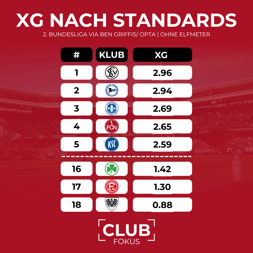 Etwas überraschend hingegen ist, dass der FCN bei Offensiv-Standards rein statistisch zu den besten Teams der 2. Bundesliga zählt. Auf Grundlage der Chancenqualität und -quantität nach ruhenden Bällen gibt es laut Opta nur drei Mannschaften, die mehr Torgefahr erzeugen. Laut DFL-Daten ist der Club bei Ecken die sechstgefährlichste Mannschaft, bei Freistößen sogar die gefährlichste der gesamten Liga.