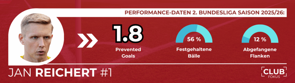 Sein bislang überzeugendes Torhüterspiel wird zusätzlich durch die Statistik der Expected Goals untermauert: Laut diesen verhinderte Reichert fast zwei Gegentore mehr, als zu erwarten gewesen wäre – ein Top-7-Wert in der 2. Bundesliga. Auch das ist eine deutliche Steigerung gegenüber der Vorsaison, in der er noch mehr Gegentore kassierte, als statistisch zu erwarten war.