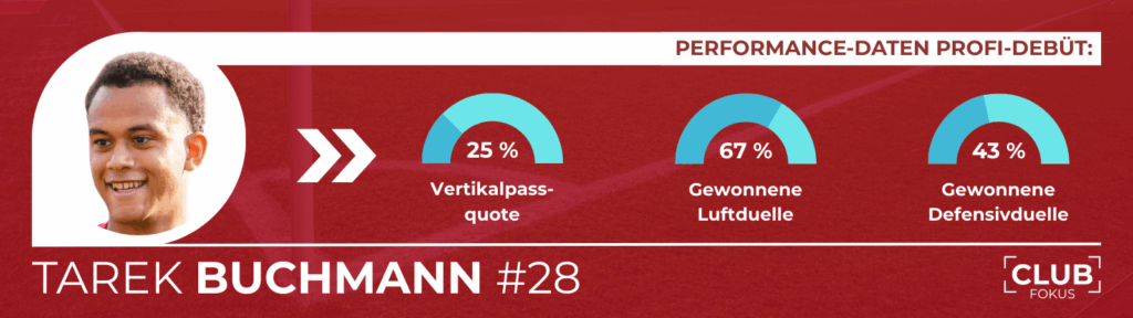 Auch mit Ball zeigte er gegen das aggressive Walter-Pressing teilweise solide Ansätze, wenngleich seine Passquote am Ende bei nur 69% lag. Die Mehrzahl seiner Fehlpässe war aber vielmehr die Folge eines langen Schlags, um unnötigen Drucksituationen aus dem Weg zu gehen. Unter dem Strich muss man Tarek Buchmann angesichts der Umstände zumindest ein ordentliches Zweitligadebüt bescheinigen, auf dem sich sicherlich aufbauen lässt und das weitere Einsätze in der Restrückrunde durchaus vorstellbar macht.