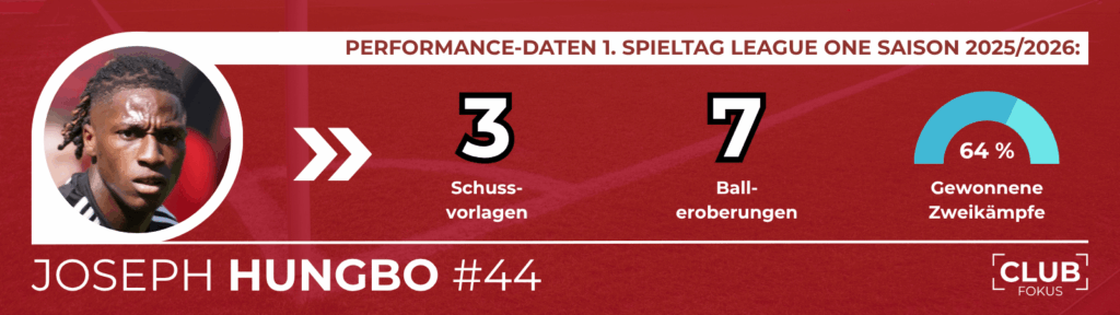 Mit Erfolg: Beim 3:1-Auftaktsieg über Northampton glänzte Hungbo mit zwei Torvorlagen. Beide Male fanden seine präzisen Hereingaben – einmal nach einem Lauf über die linke Seite, einmal nach einer Ecke – den Torschützen. Auch gegen den Ball zeigte sich der agile Linksfuß engagiert und wurde nach seiner Auswechslung mit Ovationen der Fans gefeiert.