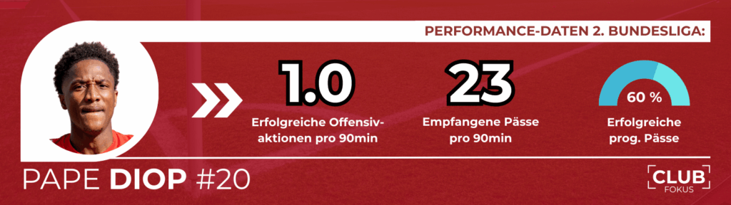 Im Sommer war der 1. FC Nürnberg sehr froh darüber, den Mittelfeldspieler auf Leihbasis verpflichten zu können. Vor allem, da man ihn schon länger auf dem Radar hatte. „Unsere Scoutingabteilung beobachtet Pape seit Langem. Bisher waren die wirtschaftlichen Rahmenbedingungen, allen voran die hohe Ablösesumme, nicht realisierbar“, freute sich FCN-Sportvorstand Joti Chatzialexiou auf der Vereinswebsite über die Last-Minute-Verstärkung von Pape Demba Diop.