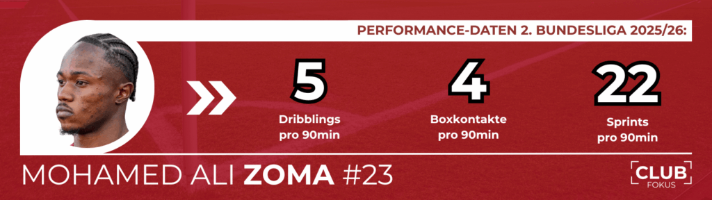 Mohamed Ali Zoma ist bislang der einzige Neuzugang des 1. FC Nürnberg, der durch den Datenscouting-Partner Jamestown Analytics gefunden worden sein soll. Mit seinen neun Toren und zwei Vorlagen schlug der aus der dritten italienischen Liga gekommene Stürmer voll ein. Zudem überragt der 22-Jährige in vielen weiteren Performance-Daten der 2. Bundesliga – etwa bei Dribblings, Abschlusseffizienz, Ballaktionen im gegnerischen Strafraum, Sprints oder auch der Maximalgeschwindigkeit.