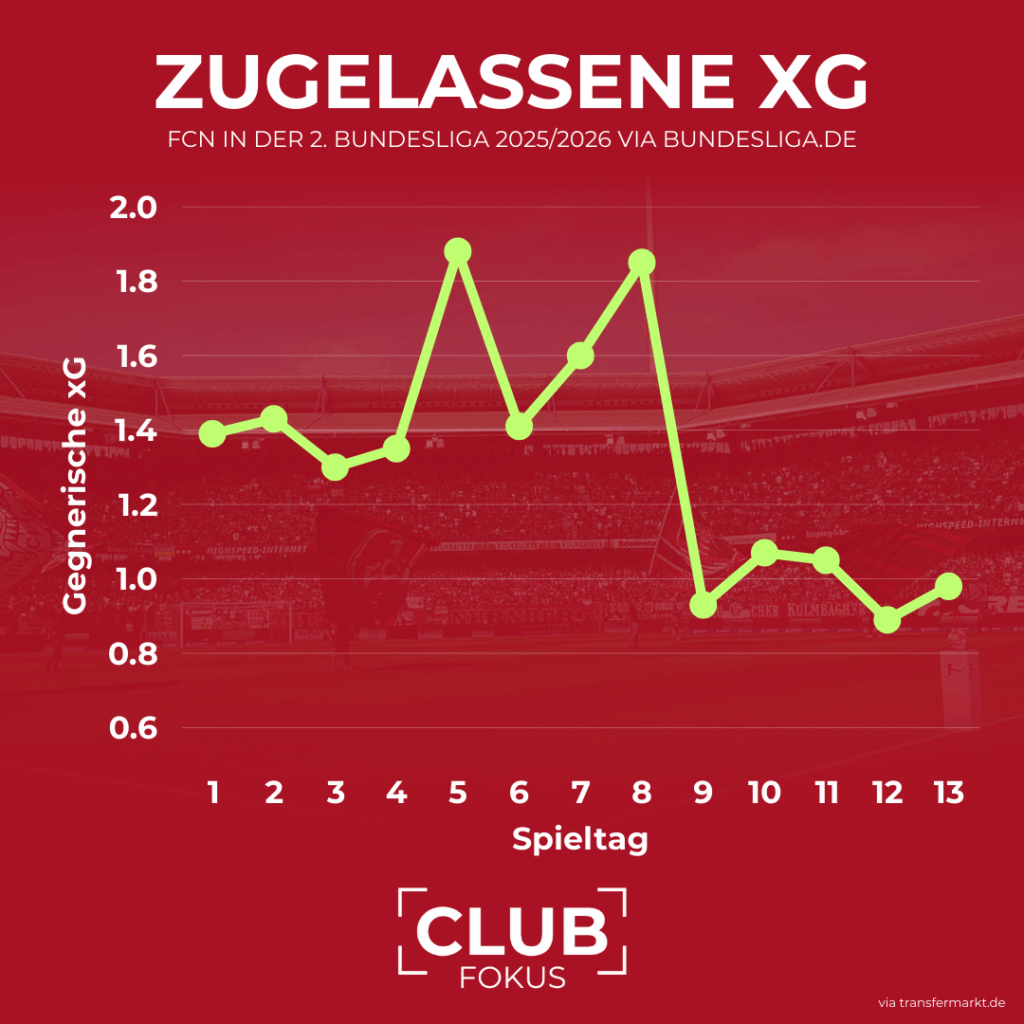 Grundlage für diesen Lauf ist die inzwischen deutlich stabilisierte Defensive. Gemessen an der Qualität und Quantität der gegnerischen Abschlüsse ließ nur der FC Schalke 04 (4,3 zugelassene Expected Goals) in den letzten fünf Spielen weniger zu als der Club (4,9). In keinem dieser fünf Spiele kam der Gegner auf einen xG-Wert über 1,07, dreimal lag dieser sogar unter 1,0. Folglich kassierte der FCN in diesem Zeitraum nur vier Gegentore und feierte gegen Arminia das zweite Zu-Null-Spiel dieser Saison. An den vorherigen acht Spieltagen hingegen gelang es kein einziges Mal, den gegnerischen xG-Wert unter 1,3 zu halten – entsprechend kassierte man damals im Schnitt 1,5 Gegentore pro Partie.