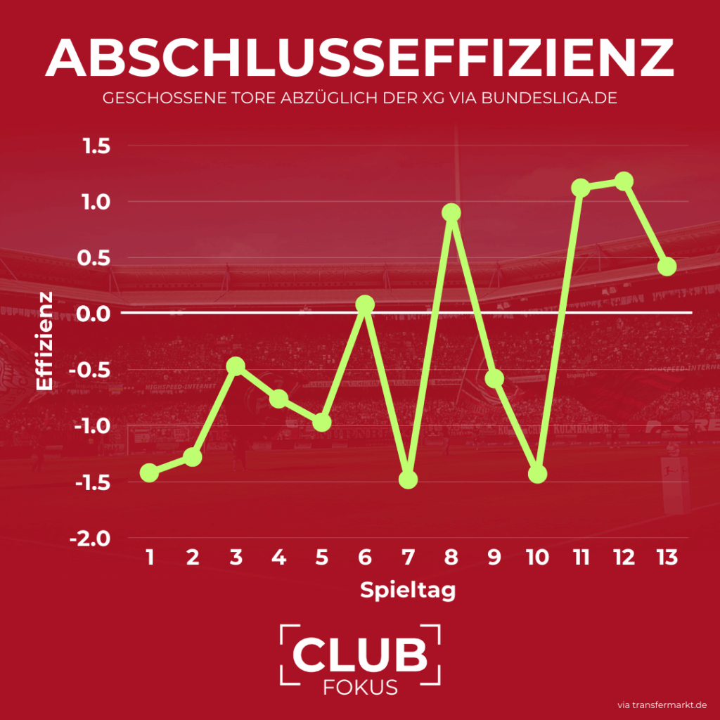 Ebenfalls essenziell für den aktuellen Erfolg ist die neu gewonnene Effizienz vor dem gegnerischen Tor. Von Spieltag 1 bis 7 brauchte die Klose-Elf im Schnitt 25 Abschlüsse für ein Tor – negativer Ligahöchstwert. Seitdem entwickelte sie sich von einer minimalen zu einer maximalen Chancenverwertung und benötigte in den letzten sechs ungeschlagenen Partien nur noch sechs Schüsse pro Treffer – der zweitbeste Wert der Liga. Auffällig: Fünfmal in dieser Saison erzielten die Franken mehr Tore, als es laut xG zu erwarten gewesen wäre – ausnahmslos in allen fünf Saisonsiegen. Sprich: Effizienz ist der Schlüssel zum Erfolg.