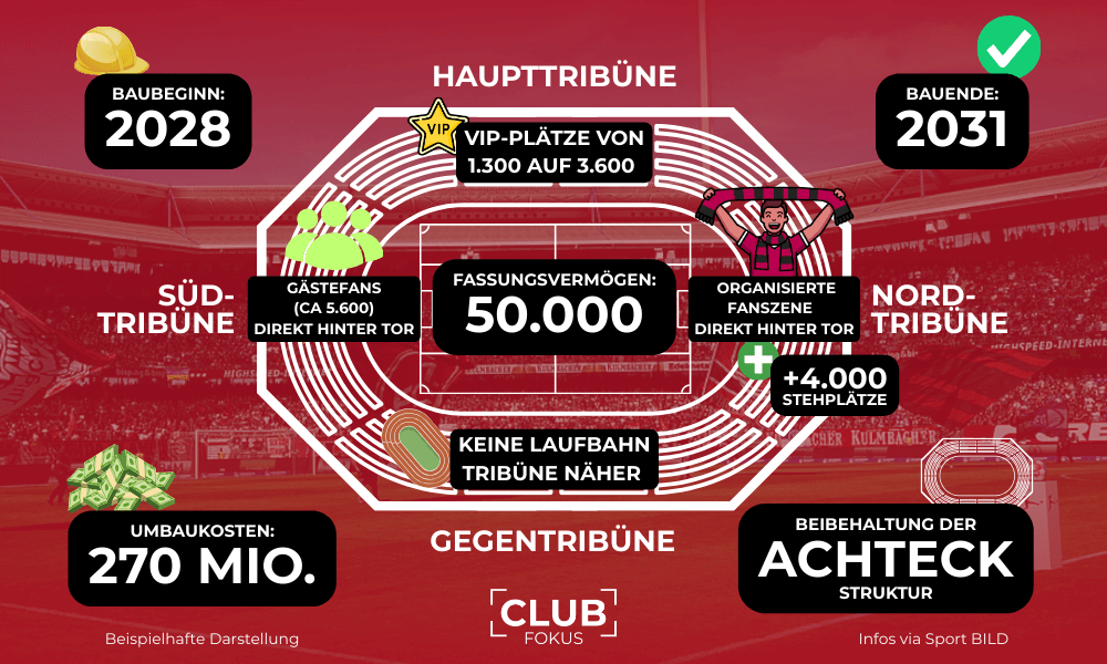 Die Planungen für ein neues Stadion des 1. FC Nürnberg laufen weiter auf Hochtouren. Am Standort des aktuellen Max-Morlock-Stadions soll weitgehend ein Neubau entstehen. Vor wenigen Wochen veröffentlichte die BILD erste Entwürfe, wie eine solche reine Fußballarena aussehen könnte – der CLUBFOKUS fasste diese in folgender Grafik zusammen.
