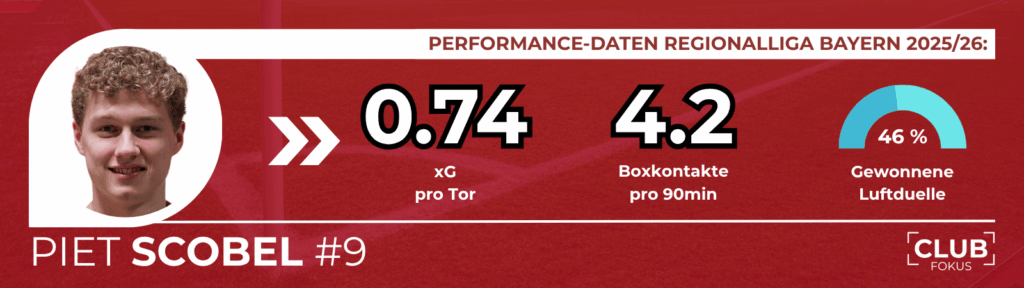 Dass der 1. FC Nürnberg einen Stürmer mit Scobels Profil gut gebrauchen könnte, zeigt nicht nur die aktuelle Torausbeute der Profis, sondern auch seine Leistungsdaten in der Regionalliga. Anders als seine Kollegen im Profikader braucht er nur wenige Chancen und erzielte bereits über zwei Tore mehr, als anhand der Expected Goals zu erwarten gewesen wäre. Zudem kann er mit seiner Robustheit als klassischer Zielspieler und Exitlösung fungieren, ist sehr boxpräsent, führt und gewinnt ligaweit überdurchschnittlich viele Luftduelle – zwei seiner Treffer erzielte er per Kopf.