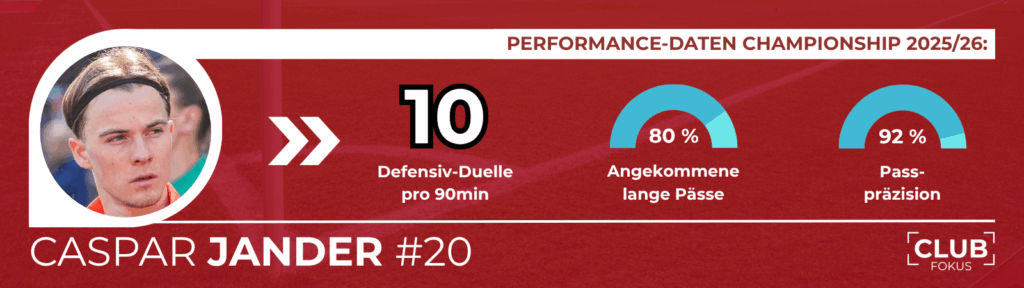 Auch für Jander persönlich läuft es zumindest leistungstechnisch nicht schlecht. An seine aus der 2. Bundesliga bekannten Topwerte in puncto Passspiel und defensiver Präsenz knüpfte er im ihm liegenden, ballbesitzorientierten Spiel der Saints nahezu nahtlos an. Dafür erhält der filigrane Rechtsfuß bereits viel Wertschätzung von Trainer Will Still und den Fans.