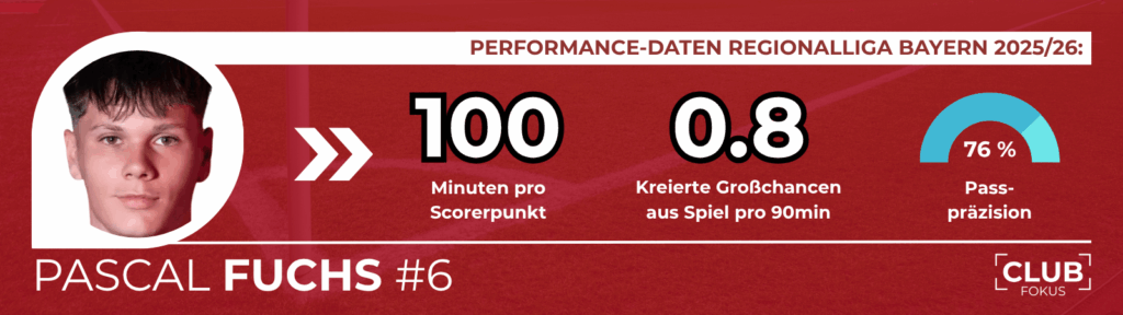 Ohnehin zählt der Pass hinter die Abwehr zu seinen größten Stärken. Pro 90 Minuten spielt der filigrane Rechtsfuß die viertmeisten dieser Zuspiele (1.4) in der laufenden Regionalliga-Bayern-Saison – bei einer starken Erfolgsquote von über 50 Prozent. Auch beim Überspielen gegnerischer Linien gehört der risikofreudige Achter mit acht progressiven Pässen pro 90 Minuten und einer Präzision von 81 Prozent ligaweit zur Spitze auf seiner Position.