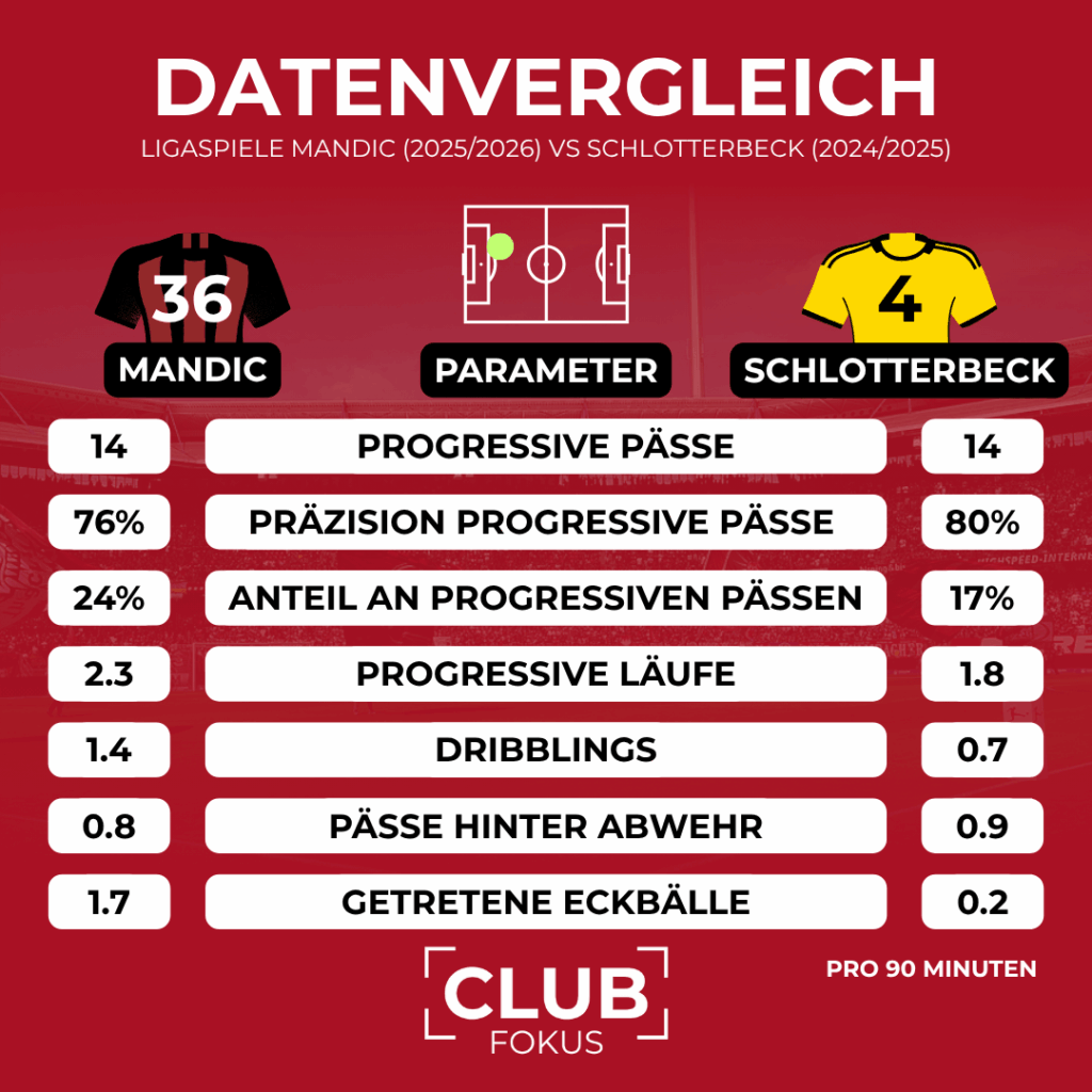 Diese Zahlen sagen wenig darüber aus, wann Mandic eine Rolle bei den Profis spielen könnte. Sie unterstreichen aber, welches seltene Profil der 1,86 Meter große gebürtige Frankfurter mitbringt – auch wenn er in Bereichen wie Stellungsspiel und Entscheidungsfindung im Aufbau noch Entwicklungspotenzial besitzt.